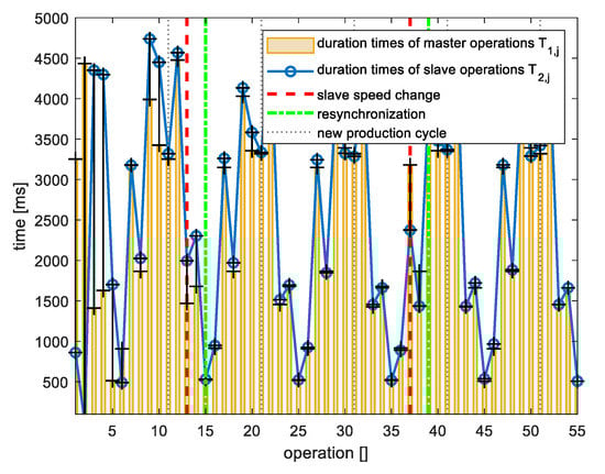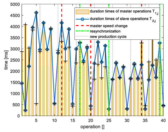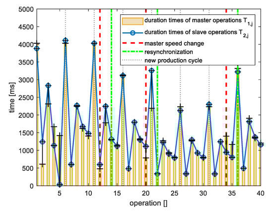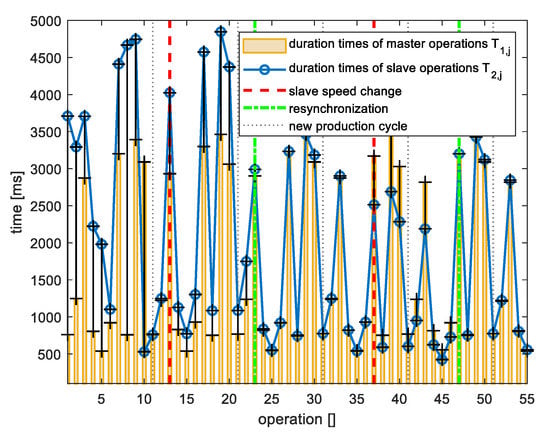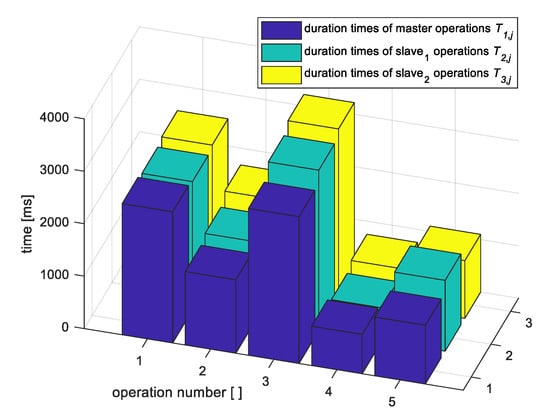 Duration times T1,j of master manipulator M1 operations were simulated as generated random values of a vector in the range of 0–5000 ms. Each value T1,j was modified during its processing with a random element from the range (−2%, +2%), that represents a stochastic process part. Because the synchronization algorithm for all slave manipulators MSi is identical, the case with one slave manipulator MSi, where i = 2, was validated by simulation. Operation durations Ti,j of this slave manipulator were simulated on the basis of Equation (6).