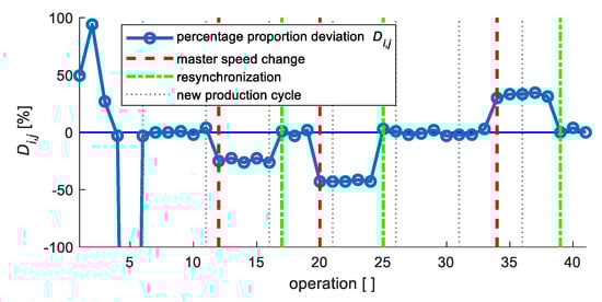 The variable D is calculated in each step of the algorithm, but is only usable from the second production cycle. The first production cycle has diverse values of deviations Di,j, from first step of second cycle, Di,j within defined tolerance represent synchronized state. Every change of Di,j values exceeding the limit can be considered as a desynchronization indicator.