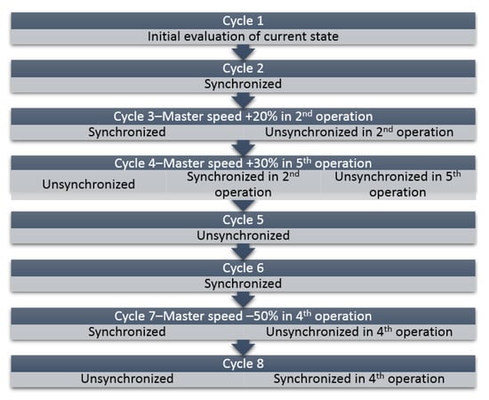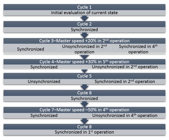 In the case of the advanced algorithm with feedforward synchronization implementation (Figure 20), the movement speed change of the master manipulator endpoint occurred in operation one during production cycle five (Figure 20d). The feedforward effect ensured production cell activities were resynchronized in the next two operations in the same production cycle (Figure 20e).