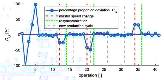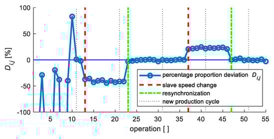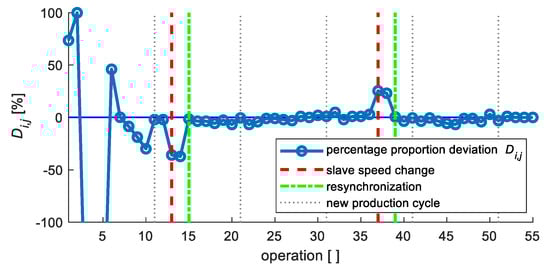 The simulation results of the experiment with a change of master manipulator speed are depicted in Figure 10 and Figure 11. Results of the experiment with a change of slave manipulator speed are shown in Figure 12, Figure 13 and Figure 14. Both experiments results, where an advanced synchronization algorithm was used, are aggregated in Figure 12 and Figure 15. These results prove that the proposed algorithm can identify a global change of speed of the master element (Experiment 2a) and also of the slave element (Experiment 2b). Most importantly, the algorithm is able to modify the speed of the slave element (elements) feedforward unlike in the case of the standard algorithm. Based on monitoring the operation duration of master and slave manipulators (Figure 10 and Figure 13), and according to evaluation of percentage proportion deviations (Figure 11 and Figure 14), it is clear that the algorithm ensured the time-synchronized movement in the 3rd step of the production cycle from such a change. This resynchronized activity is indicated by a minimized absolute value of percentage proportion deviation Di,j in the two operations after this change.