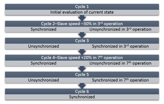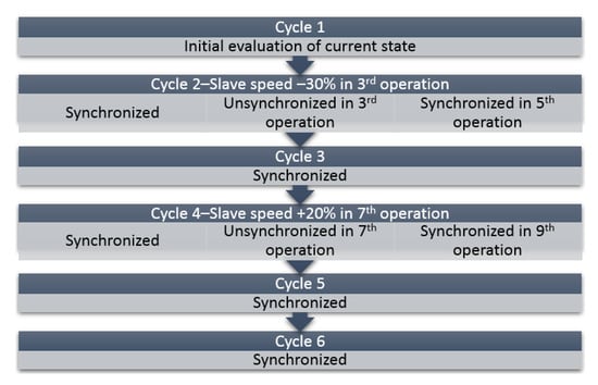 The custom function ChangeSpeed provided the modification of speed used for the current operation execution in the array of all operations speeds. These speed values were used in the next production cycle. A numerical array was also used for storing percentage proportion deviations between durations of the operation performed by master and slave objects. This array can be optionally used for feedforward synchronization. The operation duration time evaluated by a slave object (n_time) was measured in seconds (Box 5).
