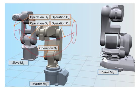 The multi-robotic cell consists of a set of n robotic manipulators M = {M1, …, Mi, …, Mn}. In the organizational structure of cell control, manipulator M1 represents the master element and a set of manipulators MS ⊂ M, MS = {M2, …, Mi, …, Mn} represents the slave elements. Each manipulator Mi performs a set of m operations O = {O1, …, Oj, …, Om} cyclically. Each operation Oj is in one cycle executed by manipulator Mi. The duration time of this operation is .