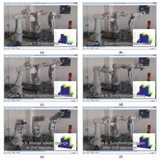 Implementation and visualization–synchronization with feedforward effect.(a) Initial cycle; (b) Nearly-synchronized state; (c) Synchronized state; (d) Master speed change cycle; (e) Resynchronized state in the same cycle; (f) Synchronized state.