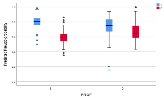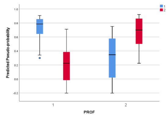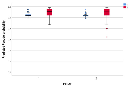 The predictive pseudo-probability of level 2 as shown in Figure 2, further confirms the findings of Table 4. Pseudo-probability is the combined likelihood of all random variables [71]. Consequently, predictive pseudo-probability further confirms the classification of the predicted output. Predictive pseudo-probability, there is further confirmation of Table 4 in a graphical format. The predictive pseudo-probability is a confirmation of the correct percentages in Table 4. Figure 3 reveals the blue box to the ‘y’ axis as values above 0.5. The blue boxes, which are also labelled as 1, represents the QS. This shows that the cases are correctly classified. The classification of 2, which is the CPM shows that the majority of the blue boxes below are below 0.5.