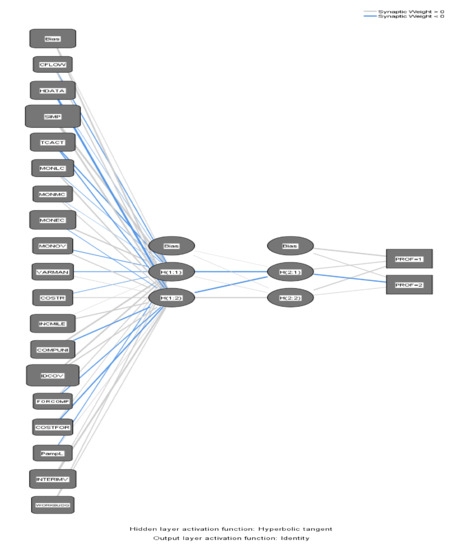 Figure 4 displays the connections between the variables and variables. The model output selected 47.4% of the training sample, 29.6% of testing and 23.0% of the holdout samples. Table 8 indicates the values. Site meetings and planning activities (SIMP) have a connection with H(1:1). This is consistent with monitoring equipment cost (MONEC) and the compounding unit (COMPUNI). Hidden layer H(1:2) is strongly associated with H(2:1). H(2:1) has a strong classification with the CPM.