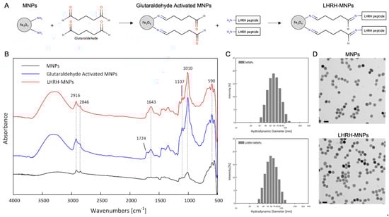 (A) Conjugation process of LHRH-MNPs. LHRH peptides were conjugated to the surfaces of MNPs via glutaraldehyde crosslinking chemistry to generate LHRH-MNPs. (B) Fourier-transform infrared spectroscopy (FTIR) spectra of MNPs, glutaraldehyde activated MNPs and LHRH-MNPs, showing successful conjugation. (C) Hydrodynamic diameter distribution of MNPs and LHRH-MNPs, as measured by dynamic light scanning (DLS). (D) Transmission electron microscopy (TEM) micrographs of MNPs and LHRH-MNPs. Scale bars are 100 µm. [].