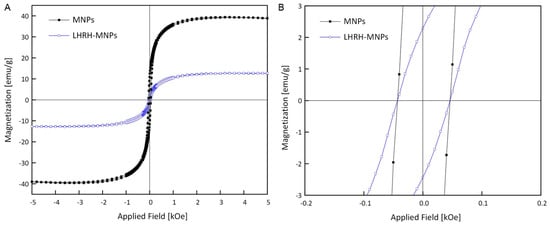 The saturation magnetization was further decreased with the addition of LHRH, possibly due to the presence of the peptides. As observed, MNPs and LHRH-MNPs exhibited non-negligible coercive fields at room temperature (25 °C), indicating that the systems did not exhibit superparamagnetic properties. Due to the existence of coercivity (approximately 45 Oe for both nanoparticles) and remanence (11.0 emu∙g−1 for MNPs and 2.3 emu∙g−1 for LHRH-MNPs) after the removal of the magnetic fields (Figure 2B), both MNPs and LHRH-MNPs were shown to be ferromagnetic at room temperature, indicating that they can be manipulated by an external magnetic field. Therefore, MNPs and LHRH-MNPs can serve as potential MRI contrast agents for cancer imaging.