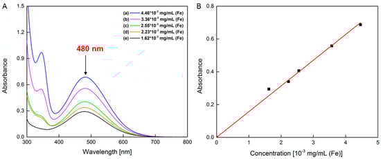 A calibration curve was thus obtained by plotting absorbance at 480 nm against corresponding known Fe3O4 nanoparticle concentrations. The concentrations of Fe3O4 in solution were determined from a calibration curve that was obtained from the maximum absorbance at a wavelength of 480 nm.