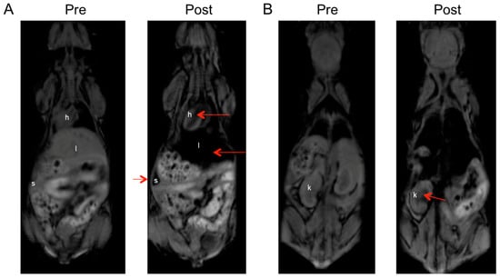 In vivo T1-weighted MRI scans of LHRH-MNPs into non-tumor-bearing nude mice (no tumors), showing darkening effect. (A) Image slice depth highlighting liver (l), heart (h) and spleen (s). (B) Image slice depth highlighting kidney (k).