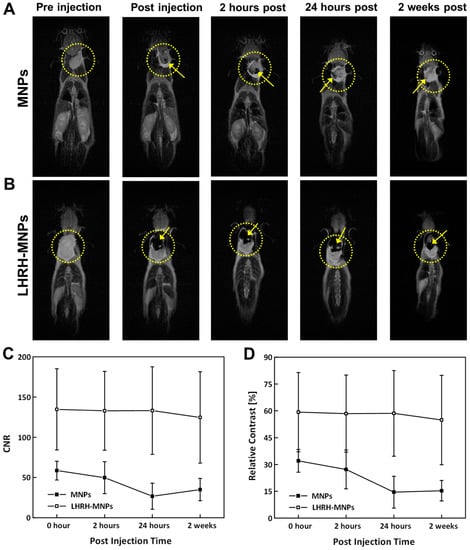 T2-weighted MR images of nude mice bearing xenograft breast tumors 4-weeks post tumor induction before and after intratumoral injection of (A) MNPs or (B) LHRH-MNPs. Tumor sites in mice are identified by yellow dotted circles, and the darkened areas within the tumors are highlighted with yellow arrows. The same animal was scanned before, immediately after, 2 h post, 24 h post and 2 weeks post nanoparticle injection. (C) CNR of tumors treated with MNPs or LHRH-MNPs. (D) Relative contrast of tumors treated with MNPs or LHRH-MNPs.