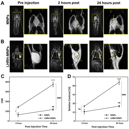 T2-weighted MR images of nude mice bearing breast tumor 4-week post tumor implantation before and after intravenous injection using (A) MNPs or (B) LHRH-MNPs. Tumor sites in mice are identified by yellow dotted rectangles, and the darkened areas within the tumors are highlighted with yellow arrows in zoomed-in images focusing on tumor sites. The same animal was scanned before, 2 h post and 24 h following nanoparticle injection. (C) CNR of MNPs and LHRH-MNPs treated tumors. (D) Relative contrast of MNPs and LHRH-MNPs treated tumors. ns: not significant; * p < 0.05; **** and ####, p < 0.0001.