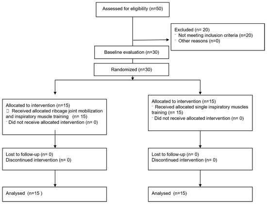 The present study was a single-blind randomized controlled clinical trial. The evaluation procedure (baseline) was performed after obtaining a signed informed consent from all subjects. Randomization was performed after the initial evaluation. Thirty subjects were randomly assigned to the experimental group (joint mobilization and inspiratory muscle straining, n = 15) or to the control group (inspiratory muscle training alone, n = 15) using the “randomization.com” website. To minimize bias, randomization was performed ensuring homogeneity of baselines characteristics between the groups (Figure 1). The subjects were not informed about the alternative hypothesis and they were instructed not to discuss the information related to the intervention methods. The experimental and the control groups completed the 6-week intervention program followed by post hoc evaluation. The evaluator was blinded to the assignment of the subjects to the experimental group or the control group. All subjects gave their informed consent for inclusion before they participated in the study. The study was conducted in accordance with the Declaration of Helsinki, and the protocol was approved by the Ethics Committee of Yong-in University (2-1040966-AB-N-01-201506-HSR-033-1).