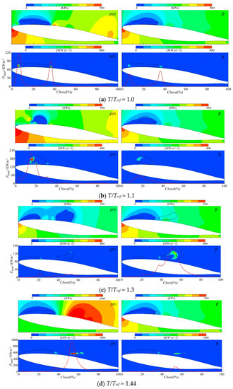 The results obtained using both p(t) and have been plotted on the left- and right-hand sides of Figure 7 for comparison. In particular, the corresponding distributions of p(t) and , the distribution of Pden as well as the evolution of Pload on the hydrofoil surface along chord (red line) have been plotted at different instants. Moreover, the isolines of αv = 0.1 (black lines) have been superimposed to those graphs to show the location of the main vapor cavities. From a general overview, it can be confirmed that the value of pd has a significant influence on the results.