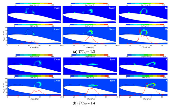 In Figure 10a, the Zwart model predicts a cloud cavity at instant 1.3 with low condensation rate on its outer region and a maximum Pload of about 60 kWm−2 which is the lowest figure compared to the other models. On the contrary, the Sauer and the Kunz models predict a smaller cavity volume and a higher Pload induced by the higher condensation rate on the outer region of the cloud. More specifically, the Kunz model predicts the highest Pload of about 240 kW m−2 at 40% of the chord because a part of the condensation region of the cloud cavity is much closer to the hydrofoil surface than in the rest of results. Similarly, the Zwart model predicts again the smallest condensation rate and Pload at instant 1.4. The other two models predict a relatively higher intensity especially for the Kunz one. At instant 1.5, the cloud cavity still presents a large volume with the Zwart model, meanwhile with the Sauer model the cavity already vanishes at instant 1.44, as shown in Figure 6d, and it reappears with a very small volume due to the collapse rebound. With the Kunz model, the cloud cavity finishes its final collapse at this particular instant. This indicates that the final collapse occurs at different instants and at different chord locations depending on the cavitation model. Furthermore, the collapse process predicted with the Zwart model creates a lower Pload than the rest. Comparing Figure 6d and Figure 10c, it can be seen that the Sauer model predicts a much higher condensation rate than with the Kunz model when the final collapse occurs, which leads to a higher Pden and Pload, as shown in Figure 7d.