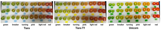 Representative MR images of three cherry tomato cultivars at different maturity stages. Row images represent cultivars, top row (Tiara), middle row (Tiara TY), and bottom row (Unicorn). Column images represent different maturity stages: green, breaker, turning, pink, light red, and red, from left to right, respectively.