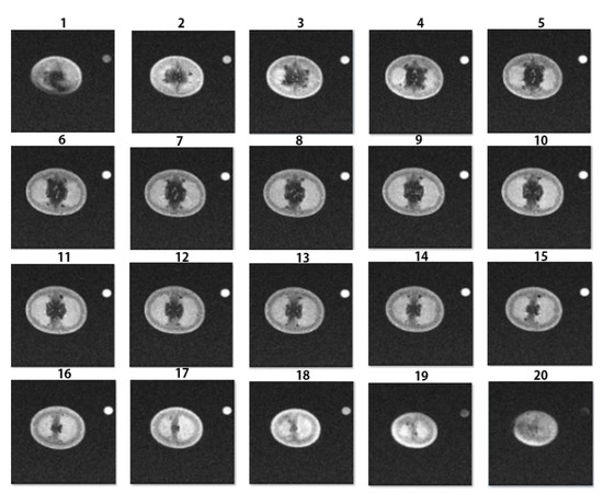 An industrial-grade MRI system (M10, ASPECT Magnetic Technologies Ltd., Shoham, Israel) installed at Jeonbuk National University in Republic of Korea was used to acquire a series of MR images of intact fresh fruits nondestructively. The MRI system was equipped with a permanent magnet, which has 1 Tesla magnetic field strength, and a radio frequency coil holding up to 80 mm outer diameter sample. A Gradient Echo (GRE) pulse sequence with three-dimensional (3D) capability was used to acquire a series of 20 two-dimensional (2D) image sets of a target sample. The repetition and echo times were set to 40 and 15 ms, respectively. The pixel size of the MR image was 256 × 256 pixels. The slice thickness was 0.001 m and the field of view (FOV) of the acquired image was 0.05 × 0.05 m. Thus, we obtained 3D volume data for cherry tomato with spatial voxels of 3.8 × 10−11 m3. The acquisition duration of a series of 20 MR images was 388 s. A total of 54 MR image datasets were acquired and examined to investigate internal structure changes of cherry tomato with different maturity stages. Figure 2 shows a series of 20 cherry tomato MR images with an olive oil reference tube, the oil reference was used for checking sample loading direction and magnet homogeneity.