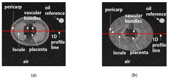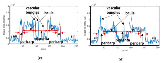 Qualitative image analysis of internal structure changes with different maturity stages were performed. Figure 5a,b shows a center slice image from a 3D MR image set of a cherry tomato at green and red maturity stages, respectively. Usually, the fruit consists of three main parts, including pericarp, locule, and placenta. Pericarp is the fruit wall including flesh and vascular bundles, locule surrounded by pericarp contains seeds and vascular bundles, and placenta is the fleshy part containing vascular bundles only. Additional investigation of the MR image signal intensity variations was done using a 1D image profile of the samples. Figure 5c shows a 1D signal intensity profile graph along a line in Figure 5a. Figure 5d shows a 1D signal intensity profile graph along a line in Figure 5b. Strong signal intensity from pericarp and locule regions was observed from the sample. However, the signal intensity from the placenta region is low compared to pericarp and locule regions, except intensity spikes due to vascular bundles within the placenta. Very strong signal intensity from vascular bundles was observed from the placenta region in cherry tomato. Also, signal intensity variations were observed from three different parts: pericarp, locule, and placenta, of the fruit. These three parts will be changed depending on fruit maturity stage.