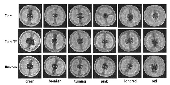 To investigate the internal structure changes of cherry tomatoes, three different cultivars (Tiara, Tiara TY, and Unicorn) were used in the study. Figure 1 shows cross-cut-section photos of all samples after the MRI experiment. Tomatoes were harvested at six different maturity stages: green, breaker, turning, pink, light red, and red, based on their colors. Three samples were prepared for each cultivar and maturity stage; thereby, a total of 54 cherry tomato fruits were investigated. The cherry tomatoes were grown under greenhouse conditions at the experimental farm in Jeonbuk National University, Korea, and harvested at different maturity stages by a horticultural expert.
