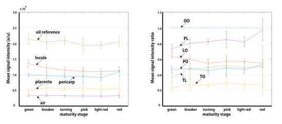 Based on qualitative investigation, quantitative analysis was performed with data acquired from 54 samples. Figure 8 shows MSI and MSI ratio variations of three cherry tomato cultivars with six different maturity stages. The ratio was calculated based on the MSI of the oil reference and the MSI of the locule region. The MSI of the oil reference changes throughout all stages without any trends due to optimization of imaging parameters, including field uniformity and receiver gain, and hence, it is used to standardize the signal intensity to yield signal variations from changes in tomato maturity only. The MSI of the three main parts of samples changes significantly throughout all maturity stages but does not show any typical trends. The MSI value of background noise from air surrounding the sample is even smaller than the placenta region. Four ratios based on the MSI of the oil reference and two ratios based on the MSI of the locule region were analyzed, as shown in Figure 8. The ratio of the MSI from the pericarp region based on the locule region shows an increasing trend with different maturity stages for all three cultivars (labeled PL in color purple on the right-side plots in Figure 8). This result indicates that cherry tomato maturity stage can be quantified nondestructively.