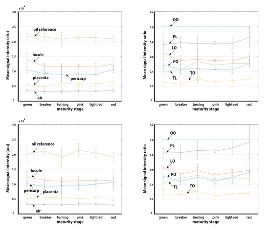 The water distribution of cherry tomatoes appears even at the final maturity stage, regardless of cultivar. However, water content appears evenly distributed in the pericarp region from breaker to light red maturity stages. MR signal intensity changes when different maturity stages are observed. Especially, signal intensity variation between the pericarp and locule regions is observed. Therefore, quantitative analysis of MSI variations of three main parts (pericarp, locule, and placenta), oil reference, and the background noise is justified.