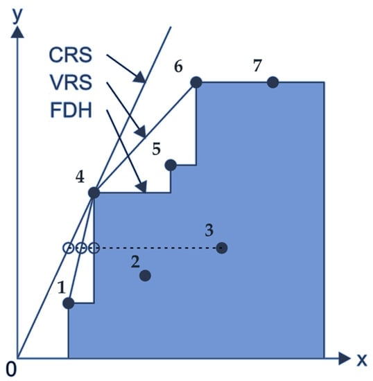 In Figure 1 and Figure 2, if any activity like 4 (, ) in Figure 1, belongs to the production possibility set (P), then the activity (, ) belongs to P for any positive scalar t. This property is a CCR model or CRS. This hypothesis can be adapted to allow the production possibility set with diverse hypothesizes. The BCC model is illustrative using by variable returns-to-scale (VRS). It is characterized by increasing returns-to-scale (IRS), decreasing returns-to-scale (DRS), and constant returns to scale (CRS). The production possibility set of the FDH model is attained by defining it inversely with CCR and BCC models. Based on the Figure 2, if 4 (, ) and 1 (, ) belong to the production possibility set of CCR and BCC models respectively, then the 5 (a ( + ), b ( + )) with any positive scalar a, b is also measured to be in the same production possibility set. The axiom is called convexity. Free impossibility means if a specific pair of input and output is producible, any pairs of more input and less output for the specific one is also producible. FDH model allows the free impossibility to construct the production possibility set. Accordingly, the frontier line for the FDH model is developed from the observed inputs and outputs, enabling free failure.