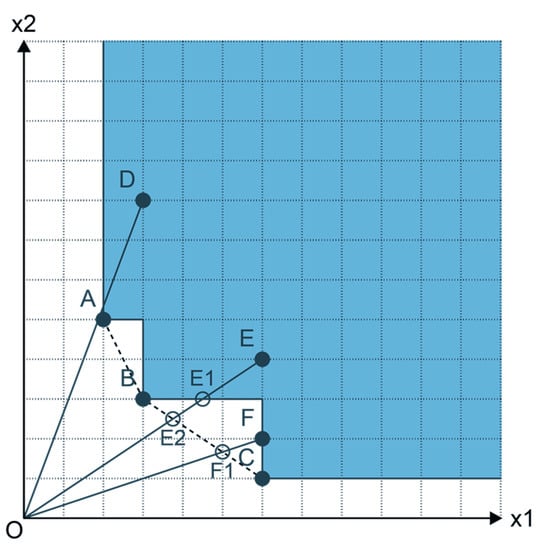 In Figure 3, the form of the production possibility set in FDH is stepwise. The frontiers determined for the FDH model are presented considering two inputs and one output for six production units labeled A through F. In the BCC model, DMUs A, B, and C are efficient, but A, B, C, and F are efficient in FDH model. The efficiency of observation E in BCC model is defined as: