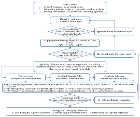 In current study, all the available companies’ datasets are applied to three exclusive models, and their DMU’s efficiency is compared to find the unfamiliar trends in cement companies. A dataset for 24 companies with one input, two intermediate products, and three outputs after converting two-stage to proposed standard single-stage model is used. Window analysis in DEA with CCR, BCC, and FDH Models are applied to test and justify the alterations between companies. The use of DEA as a decision analysis tool is limitless in literature because DEA does not focus on finding a universal relationship for all unit’s undervaluation in the sample. DEA authorities every group in the data to have its production function, and then it evaluates the efficiency of that single unit by comparing it to the efficiency of the other units in the dataset. After running the three window analysis models in DEA SOLVER with every group in the data at the first step, based on the nature and attributes of our data, the most appropriate filtering preprocess method for data mining clustering algorithms at the second step has been applied by expert judgment in WEKA. A plus point is that WEKA just provide a list of algorithms and preprocessing approaches. Thus, the best scenario based on the nature and attributes of the data, should be done by experts. In this study, after considering all the points, we propose three layers filtering preprocess which gain the most accurate results.
