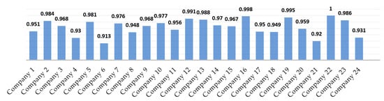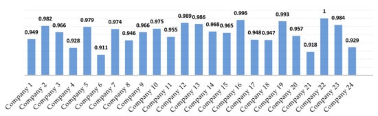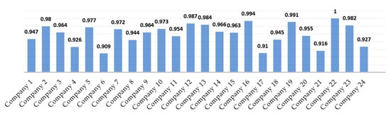 - 19th (0.950, 0.995, 1, 1, 1, 1), and 23rd (0.922, 0.955, 1, 1, 1, 1) companies have an ascending trend of efficiency from the beginning (1st year or 2014) to the end (6th year or 2019).
