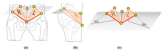Simplified geometrical model: representation of the left and right hemi-pelvises by triangles between ASIS, PSIS, and symphysis. (a) Frontal view; (b) view from the right side; (c) angles W1 and W2 between the horizontal (transversal) plane and the triangles are the basis for the calculation of the pelvic torsion. Dotted lines: pelvic anteversion.