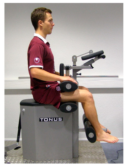 The maximum isometric torques for knee flexion and extension were measured in a sitting position using an isometry measurement device (Easytorque, Fa. Tonus, Zemmer, Germany). The knee angle was set to 80 degrees for measuring knee flexion and to 90 degrees for knee extension (Figure 3). The thighs were fixated with pads and the calves pressed isometrically against the pads, and thus against the force transducers. The test persons had to build up strength for five seconds and hold it for five more. For familiarization purposes, a trial was performed for each measurement. Both sides were tested alternatingly. At least three isometric measurements were performed for each side. Whenever the third value turned out to be the maximum value, further tests were performed until the last measurement value was smaller than the penultimate value. Only the maximum value achieved was included in the subsequent calculations. The reproducibility of this type of isometric measurement has been shown in other studies (intraclass correlation coefficient 0.97–0.99, Pearson’s correlation coefficient 0.95 [23,24].