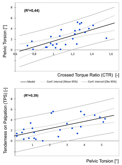 At the same time, the subgroup with higher pelvic torsion reported statistically significant higher values for tenderness to palpation (Table 2, partial η2 = 0.309, large effect). The linear regression models showed that 39% of the variance of tenderness to palpation can be explained by the pelvic torsion angle and 44% of the variance of the pelvic torsion angle can be explained by the crossed torque ratio (Figure 4).
