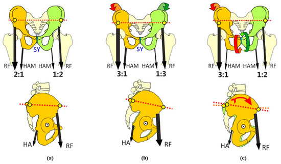 2. The absolute anterior and posterior torques are left–right different, but show the same ratio, with the torque of the knee extensors (more precisely, the torque of the rectus femoris as part of the quadriceps femoris) being predominant. This can lead to an anteversion of the pelvis, which affects both hemi-pelvises equally (Figure 5b). Shearing forces would not develop in the pubic symphysis. The influence of the relevant muscle groups on the positioning of the pelvis has been analyzed in other studies [14].