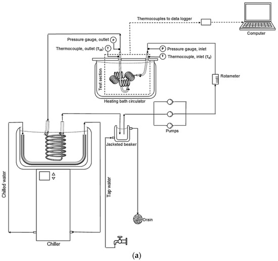 The cold section consisted of three positive displacement pumps connected in parallel (two gear pumps (models PQ-12DC, Cole Parmer, USA) and a peristaltic pump (model Masterflex L/S Easy-Load II Head coupled with a Masterflex L/S Variable-Speed Drive, Cole Parmer, Vernon Hills, IL, USA)), a rotameter (0.2–1.9 L per minute (LPM), ±2% full scale; model H205B-005 Hedland, Budger Meter Inc., USA), a benchtop recirculating chiller (750 W at 0 °C; model LS51MX1A110C, Polyscience Inc., USA), a jacketed glass beaker (500 mL; model CG-1103-04, Chemglass Inc., Vineland, NJ, USA), and a helical section (six turns, radius of curvature = 0.063 m, and pitch = 0.02 m) made of the same copper tubing as the CFI set. The working fluid passed from the test section to the cooling loop through the helical section immersed in the chilled water. From there, it was received in the jacketed glass beaker, which served as the reservoir for discharge and suction (tap water was circulated through the jacket). Thus, the working fluid was suctioned and circulated through the test section by the pump system. The flow rate was manipulated by the analog speed controller of the peristaltic pump and the plug-in class-2 transformers implemented in the gear pumps. Five flow rates that provide values ranging from 1400 to 9500 were selected. The rotameter was calibrated for each working fluid. The temperature of the chilled water was adjusted to maintain the inlet temperature of the working fluid to the CFI set within a maximum variation of ±0.5 °C for all working fluids at the designated flow rate. Trials were conducted at least twice and all systems reached steady state. The temperatures of the heated bath water and the chilled working fluid were also recorded. The room temperature was maintained at 23 °C. Including start-up, stabilization, and steady-state operation, a trial lasted approximately 90 min on average. Table 1 summarizes the experimental conditions established in this study.