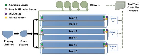 Recent advances in technology have improved the efficiency of the wastewater treatment process and paved the way for recycled water use. Nonetheless, the challenge of optimizing the treatment process while reducing operational and capital costs continues. The process of nitrification is often utilized by wastewater treatment facilities to meet ammonia effluent permit levels. To achieve full nitrification, that is, the conversion of ammonia to nitrate, the nitrifying biomass requires enough dissolved oxygen (DO), several nutrients, and an appropriate retention time [1]. One area of potential operational savings in the nitrification process is energy consumption, specifically from the mechanical blowers needed to support the aerobic portion of the treatment process [2]. The optimization of aeration through ammonia-based aeration control (ABAC) systems encourages operation at low DO concentrations. An ABAC system is composed of an open-loop and closed-loop controller that sets DO setpoints in the treatment aeration basin to maintain a predetermined ammonia setpoint at the effluent [3,4]. This decreases the overall energy consumption of the facility while maintaining high-quality effluent. Since aeration typically contributes a large percentage of a wastewater treatment plant’s energy costs due to the operational cost associated with large blowers, the development of control efforts to optimize the aeration process is essential. Moreover, utilization of novel aeration control strategies to optimize the biological processes such as nitrification or phosphorus removal, has shown to decrease plant chemical usage without sacrificing effluent quality [2].