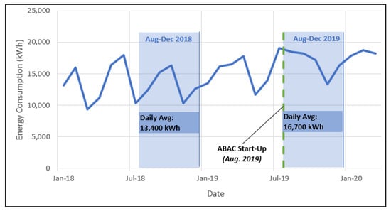 By considering ammonia mass loading and air transfer ratio, the 2019 energy consumption measured by the existing meter was normalized by two ratios: 1.70 for ammonia mass loading and 1.40 for air transfer (Appendix C). Similarly, 2018 energy consumption data were normalized using the TOC normalization ratio of 0.38 (Appendix C). By comparing the normalized energy consumption rates between both years as shown in Figure 8, the estimated savings due to the installation of the ABAC system can be captured in the months of August–December 2019. This approach decreases the effect of contaminant loading and the degradation of the diffuser panels on the metered energy consumption data and thus creates a fair comparison. Table 1 (below) summarizes the savings determined. Considering the capital cost of the ABAC system, the energy savings result in a return on investment of four years.