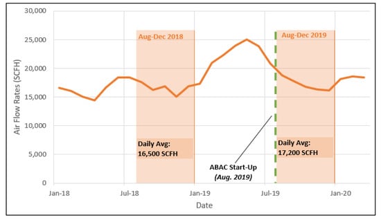 The analysis of average monthly metered energy consumption for the months the ABAC has been in service, August 2019 through March 2020, demonstrated larger rates when compared to the same months in 2018, as show in Figure 2. The increase in energy consumption is related to the increase in air flow rates [2]. The air flow rates supplied to the aeration basin by the four blowers also demonstrated an increase when comparing the periods before and after the ABAC unit was commissioned, as shown in Figure 3.
