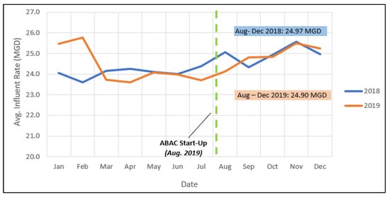 Average daily plant influent flow rate in million gallons per day (MGD). August through December 2018 showed a daily average influent feed rate of 24.97 MGD, while in 2019 it was 24.90 MGD.