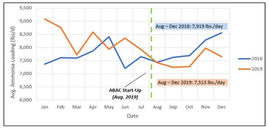 Increased air rates are typically a result of increased contaminant load to the system [7]. As shown in Figure 4, the plant influent volumetric flow rate remained steady throughout the period studied. Figure 5 shows, however, a reduction in ammonia loading to the plant during the same period. Nonetheless, other contaminant loading to the plant, such as TOC, BOD, and TSS demonstrated an increase since the installation of the ABAC unit, as shown in Figure A1, Figure A2 and Figure A3, Appendix A. Although the aeration process treats primarily for ammonia, other oxygen-demanding components, such as those mentioned, are expected to increase the need for dissolved oxygen in the basins [5].