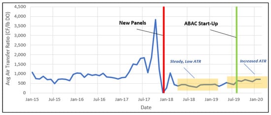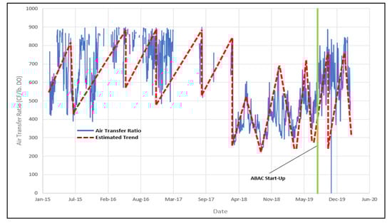 In addition to the contaminant load increase, mechanical changes to the process during the time that the ABAC system was commissioned were considered, including the air transfer ratio from the diffuser panels to the basins [8]. The air transfer ratio is a measure of the cubic feet of air at standard temperature and pressure conditions needed to transfer a pound of DO within a treatment train and is found using the Equation (2) [9]. As shown in Figure 6, the air transfer ratio for System B, Train 3, increased since early 2018. This indicates that the amount of air needed (cubic feet) has increased per pound of dissolved oxygen transferred to the system.