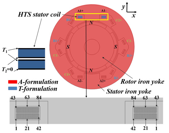 The T-A formulation model [11,12] can fully couple the A-formulation model of the generator and the HTS coil model. The efficiency of the T-A formulation model is higher than the H-formulation model due to the decrease in the degrees of freedom [11]. Moreover, the T-A formulation model can directly achieve the fully coupled simulation of the HTS coils under the generator’s electromagnetic environment because rotating generators are usually simulated by the A-formulation [13].