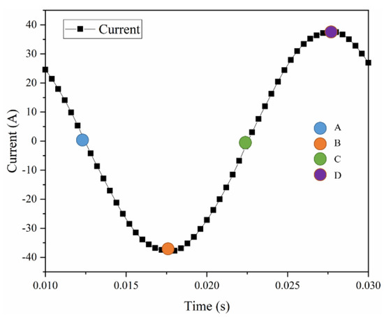 The calculated AC loss values of several representative turns, which are placed at different locations in the HTS coil, are summarized in Table 2. It can be seen that different turns of the coil have significantly different AC loss values. The calculated current waveform of the A1 coil in one cycle at the rated condition is shown in Figure 6, and four typical time moments, A, B, C and D, are chosen to show the calculation results.