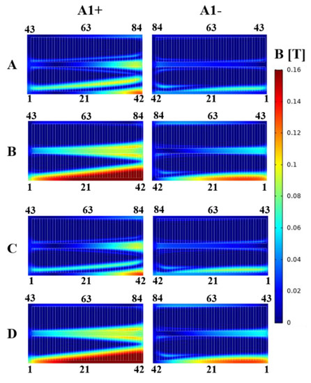 The critical current of the HTS tapes is mainly influenced by the magnetic field perpendicular to the tape surface. Figure 7 shows the perpendicular magnetic flux density magnitude distributions of the area around the HTS tapes. First, due to the lower coil being closer to the rotor than the upper coil, its surface magnetic field is significantly larger than that of the upper coil. The turn in the lower coil has a greater AC loss value than the corresponding turn with the same distance to the stator iron teeth in the upper coil (e.g., turn 42 and turn 84). In addition, the perpendicular magnetic field in region A1+ is much greater than that in the A1− region. Although the average perpendicular magnetic field of turn 42 in the A1− region is less than turn 21, the average perpendicular magnetic field of turn 42 in the A1+ region is much greater than turn 21, which makes the AC loss of turn 42 greater than turn 21.