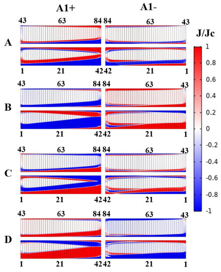 Figure 8 shows the normalized current density distribution of the HTS tapes. The normalized current density distribution is similar to the perpendicular magnetic field distribution. The critical current degradation is more severe in each turn of the lower coil due to the greater perpendicular magnetic field, so the current penetration into the interior of the HTS tapes is more severe, making the AC loss greater than the upper coil. Turn 42 in the lower coil suffers the maximum surface perpendicular magnetic field and has the minimum critical current because it is nearest to the iron teeth, which attracts the flux lines. Its current penetration is also the most severe and it has the greatest AC loss value.
