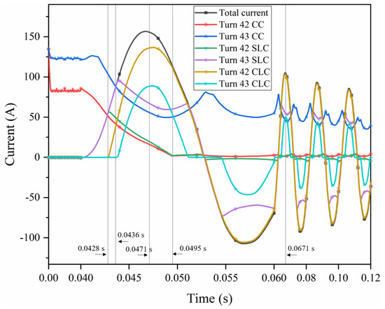 It can be clearly found that the total current increases rapidly after the occurrence of the short circuit fault. The critical current of turn 42 is much lower than that of turn 43 because of the different magnetic field environments on their surfaces. When the total current first exceeds the CC of turn 42 (0.0428 s), the excess current flows through the copper layer, producing the ohmic loss and raising the temperature. However, turn 43 is still in the superconducting state. As the short circuit current increases further, the total current exceeds the CC of turn 43 (0.0436 s); due to its high critical current, the copper layer current of turn 43 is less than turn 42′s, resulting in less ohmic loss and a lower temperature rise.