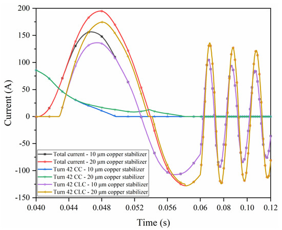Figure 11 depicts the variations in the total current, the critical current and the copper layer current of turn 42 after the occurrence of the worst short circuit fault, with copper stabilizer thicknesses of 10 μm and 20 μm. Figure 12 depicts the ohmic loss values and the temperature values of turn 42 after the occurrence of the worst short circuit fault with copper stabilizer thicknesses of 10 μm and 20 μm.