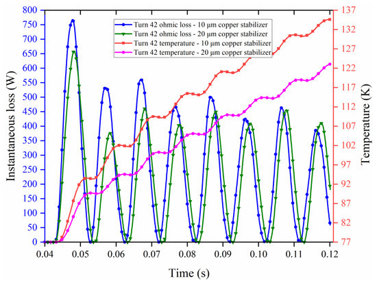 Waveforms of the ohmic loss values and the temperature values of turn 42 after the occurrence of the worst short circuit fault with copper stabilizer thicknesses of 10 μm and 20 μm.