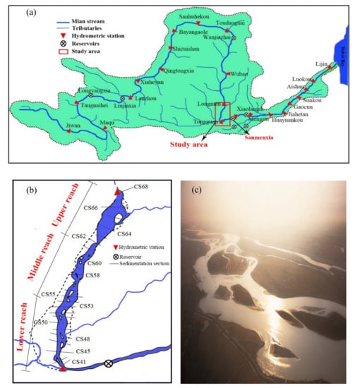 The Xiaobeiganliu reach spans from Longmen (LM) to Tongguan (TG) in the Middle Yellow River, which is located between 110°15′–110°38′ E longitude and 34°35′–35°49′ N latitude (Figure 1a). The main stream in this reach is scattered and changeable, with rapid and frequent channel lateral migration. Bank erosion has often occurred in this reach because the bank soil is easily eroded and there has been a lack of bank revetment works (Figure 1c). The total length of this reach is 132.5 km, with an average channel width of 8.5 km and an area of approximately 1107 km2. The sedimentation sections in this reach are successively named CS41 to CS68 from the lower to the upper reaches (Figure 1b), and the sections are surveyed twice a year to monitor the channel adjustments. The Xiaobeiganliu reach is usually divided into the upper, middle, and lower reaches. The upper reach is from LM (CS68) to Miaoqian (CS61), with a length of 42.5 km, and it is characterized by severe channel lateral migration. The composition of the bed material is relatively thick, with the median diameter of bed material (D50) generally being between 0.2 and 0.3 mm. The reach from Miaoqian (CS61) to Jiamakou (CS54) is defined as the middle reach, with a length of 30 km. It is located at the top of the tertiary red soil anticline, so the channel is relatively stable. The lower reach is from Jiamakou (CS54) to TG (CS41), with a total length of 60 km and channel bed slope of 3‰ [33].