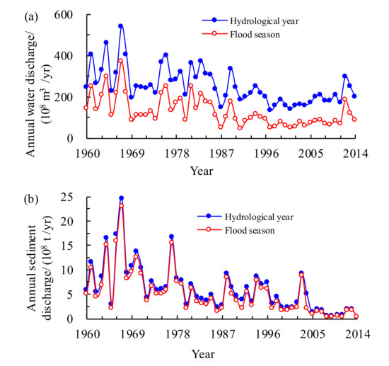 Temporal variations in the flow and sediment regime entering the Xiaobeiganliu reach: (a) annual water discharge; (b) annual sediment discharge.