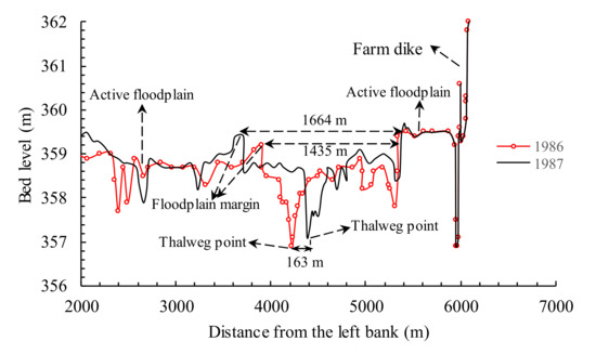 Channel width adjustment was considered to be closely associated with channel lateral migration [31,34]. In this study, the parameter of bankfull width (Wi) was used to investigate the channel width adjustment in the Xiaobeiganliu reach. In general, the lip-top level of an active floodplain at a section is termed the bankfull level, and the main-channel width between the two floodplain margins on left and right banks is defined as the bankfull width [16,35]. The thalweg migration distance (Di) was used to represent the magnitude of lateral migration in the current study, which was determined to be the lateral distance between two thalweg points in the previous and current years at one section [5]. For example, Figure 4 shows the post-flood cross-sectional profiles measured in 1986 and 1987 at the section of CS61. According to the method, the bankfull widths were determined to be 1435 m in 1986 and 1664 m in 1987, and the thalweg migration distance in the two years was determined to be 163 m.