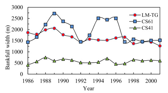 The bankfull widths at sedimentation sections were determined in the Xiaobeiganliu reach in 1986–2001. The section-scale bankfull widths ranged between 600 and 3965 m in 2001, which indicated that the bankfull width varied significantly along the Xiaobeiganliu reach. Figure 5 shows the temporal variations in the bankfull width at the sections of CS61 and CS41 from 1986 to 2001. The figure shows that the bankfull width at the CS61 section fluctuated dramatically during this period, with the values varying between 1435 and 2719 m. The maximum bankfull width occurred in 1989 because the mean water discharge in this year was greater than the discharges in other years. The bankfull width did not change much at the CS41 section, with the magnitude increasing from 411 m in 1986 to 601 m in 2001. There are two main reasons for the spatial difference: one is that the bank soil at the CS61 section was easier to erode than that at the CS41 section; the other is that there was lack of enough river training works to limit river bank retreat at the CS61 section during this period. The reach-scale bankfull width of the Xiaobeiganliu reach was calculated using the Equation (1), as shown in Figure 5. The reach-scale bankfull width showed a decrease trend from 1866 m in 1986 to 1266 m in 2001, although bank retreat often occurred in the Xiaobeignaliu reach in the non-flood seasons. This result is mainly because hyperconcentrated floods with sediment concentrations greater than 300 kg/m3 often occur in the flood season in this reach [38,39]. During a hyperconcentrated flood, water with very large amounts of sediment overtops the original bankfull level, and severe sediment deposition occurs on the floodplain marginal, with a new lip being formed, which causes the bankfull geometry to become narrower and deeper [40,41]. The decrease of bankfull width shrank the main channel in the Xiaobeiganliu reach, which may cause extreme high-water levels during flood seasons and bring potential hazards to the safety of people and levees.